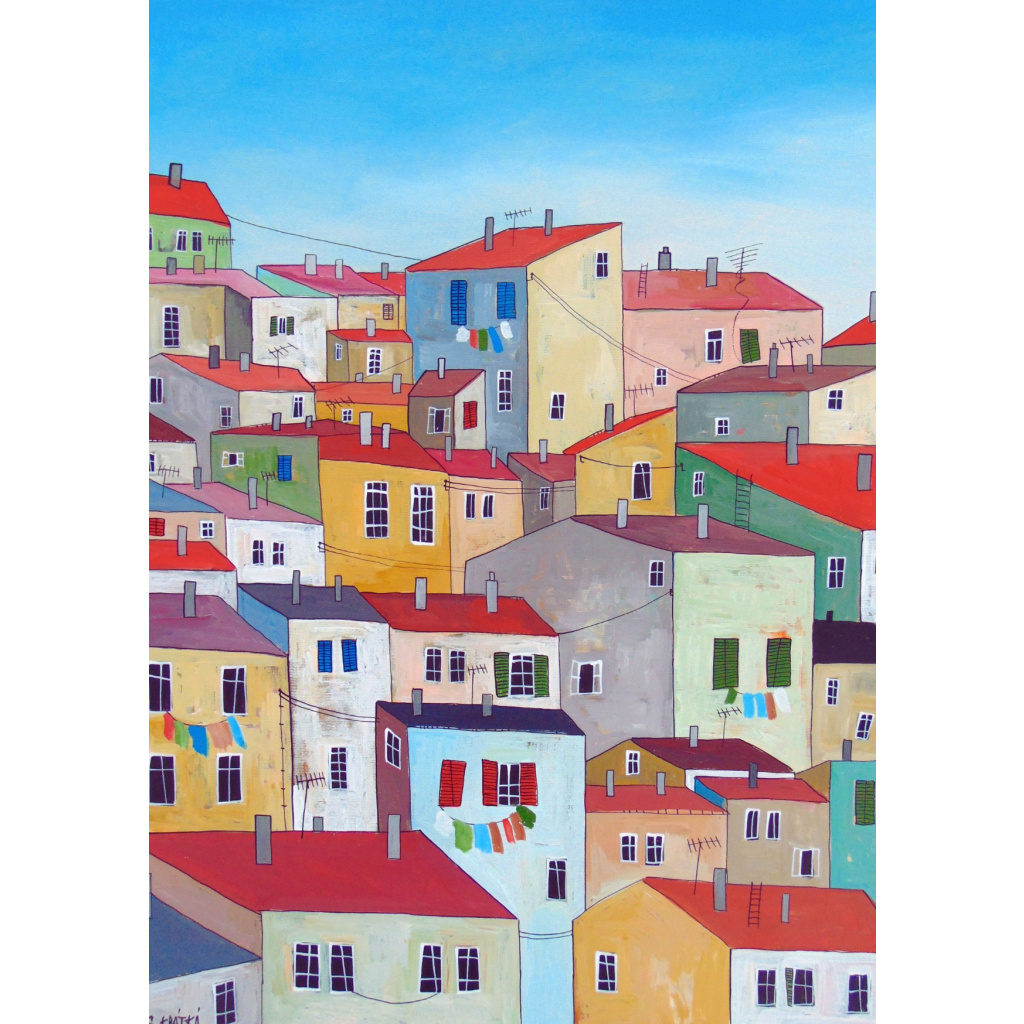 Autorská pohlednice Slávky Krátké s motivem obrazu Barevný den.